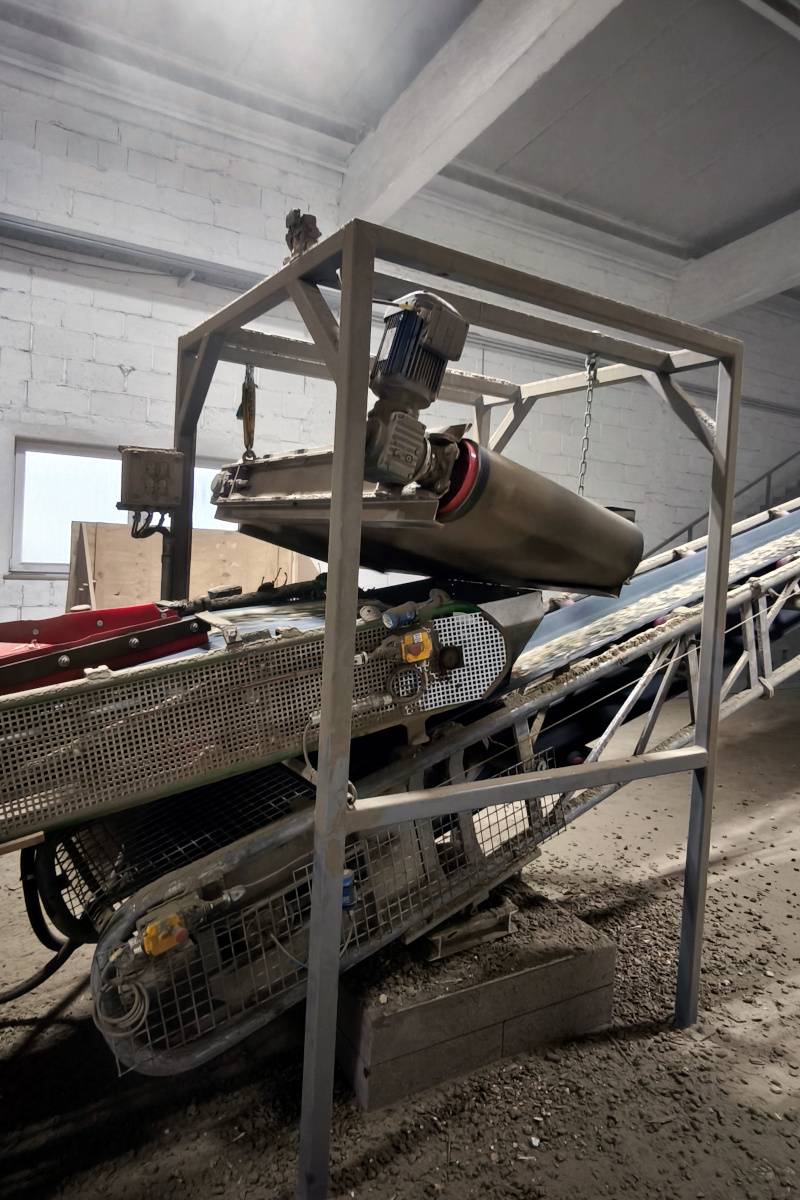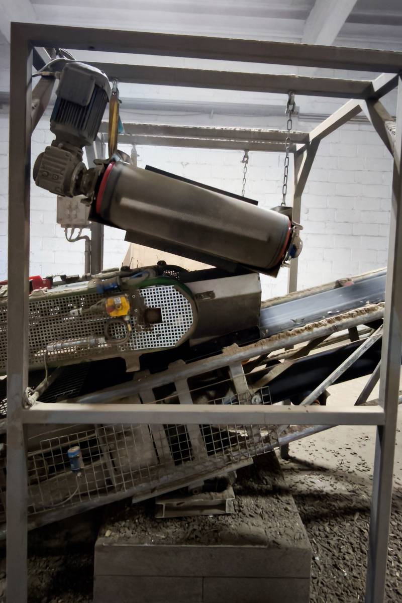 Sobre la cinta transportadora se instaló una placa magnética autolimpiante DND-AC, suspendida transversalmente a la cinta. Su función es capturar de forma fiable los clavos ferrosos directamente del flujo de material triturado, sin intervención del operario y sin interrumpir el proceso.