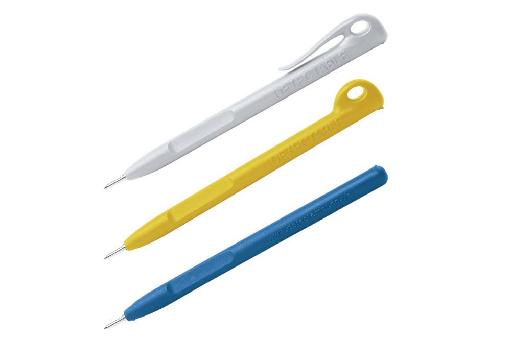 Tenemos bolígrafos detectables, disponibles en hasta ocho colores: azul, negro, rojo, verde, amarillo, blanco, violeta y naranja. También puede elegir entre cuatro tipos de tinta: azul, negra, roja y verde. También ofrecemos tres tipos de extremos: con clip, sin clip o con ojal para colgarlo fácilmente alrededor del cuello.