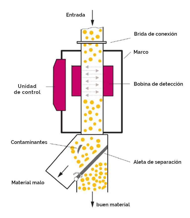El detector de metales de la serie Quicktron se instala en una tubería que transporta materiales friables en caída libre. El material inspeccionado pasa a través de la bobina de detección. Si el material está contaminado con un contaminante metálico, la bobina detecta este metal y emite una señal para abrir la aleta. El contaminante metálico, aun con parte del material, es redirigido a la tolva del material incorrecto. Luego, la aleta vuelve automáticamente a su posición original. El funcionamiento del detector, incluida la eliminación de contaminantes, es totalmente automático.