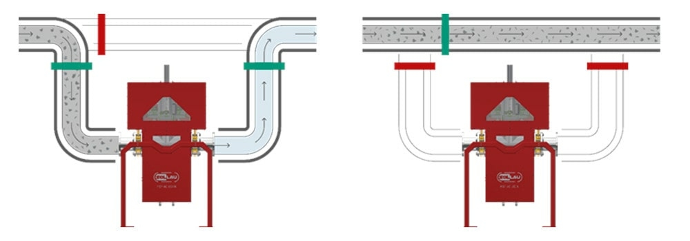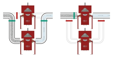 Los filtros autolimpiables se instalan en la tubería. En el momento de limpiar el separador, es necesario cerrar el suministro del material procesado. En el caso del funcionamiento continuo, donde no es posible interrumpir el flujo de material, recomendamos instalar el separador en un bypass de la tubería. Dependiendo del grado de contaminación del material, es conveniente utilizar una de las tres opciones de instalación del separador magnético en el bypass de la tubería.