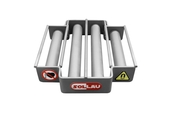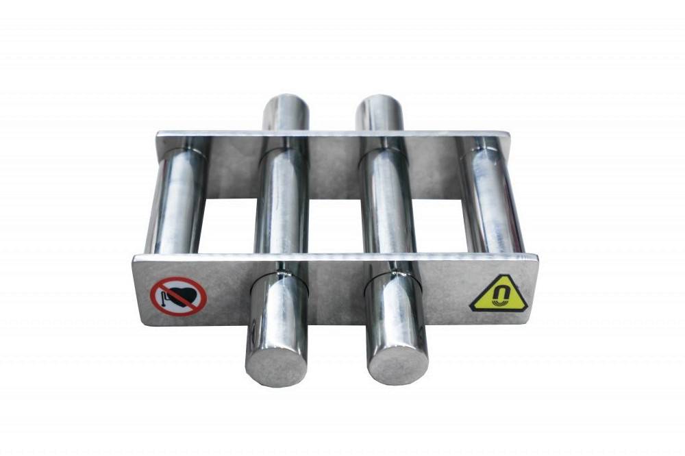La rejilla de acero inoxidable, en la que los núcleos de acero inoxidable están sellados herméticamente, está pulida, sin embargo, no tiene un sistema de limpieza fácil y, por lo tanto, es necesario eliminar las impurezas de Fe atrapadas manualmente (por ejemplo, limpiando la superficie de la rejilla). Por otro lado, esta versión del imán de la tolva está equipada con los imanes de neodimio más fuertes existentes, generando una inducción magnética extremadamente alta (alrededor de 13,500 G) en la superficie de la parrilla.