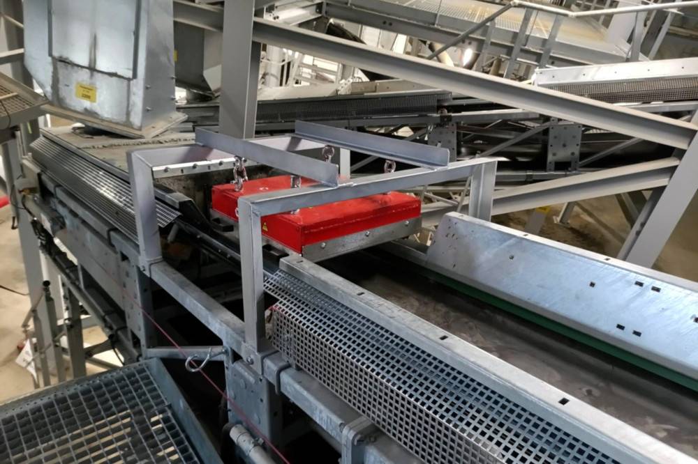 El imán suspendido con limpieza manual es una solución simple y poco exigente para quitar partículas ferromagnéticas de los materiales transportados en una cinta transportadora. Este modo de separación de partículas férricas se utiliza sobre todo en caso de materiales con menor contenido de partículas hierro (= no se exige limpiar la placa con una frecuencia mayor que, por ejemplo, una vez por turno de trabajo).