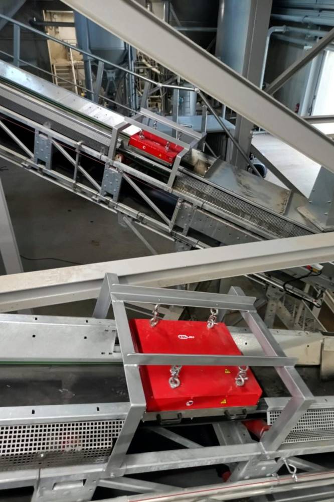 Para lograr el mayor grado posible de separación, recomendamos (sobre todo en el caso de una capa de material más alta en la cinta transportadora), combinar la placa magnética suspendida DND-MC con una polea magnética MV (que es capaz de extraer las partículas de hierro de las capas inferiores del material que circula por la cinta transportadora).