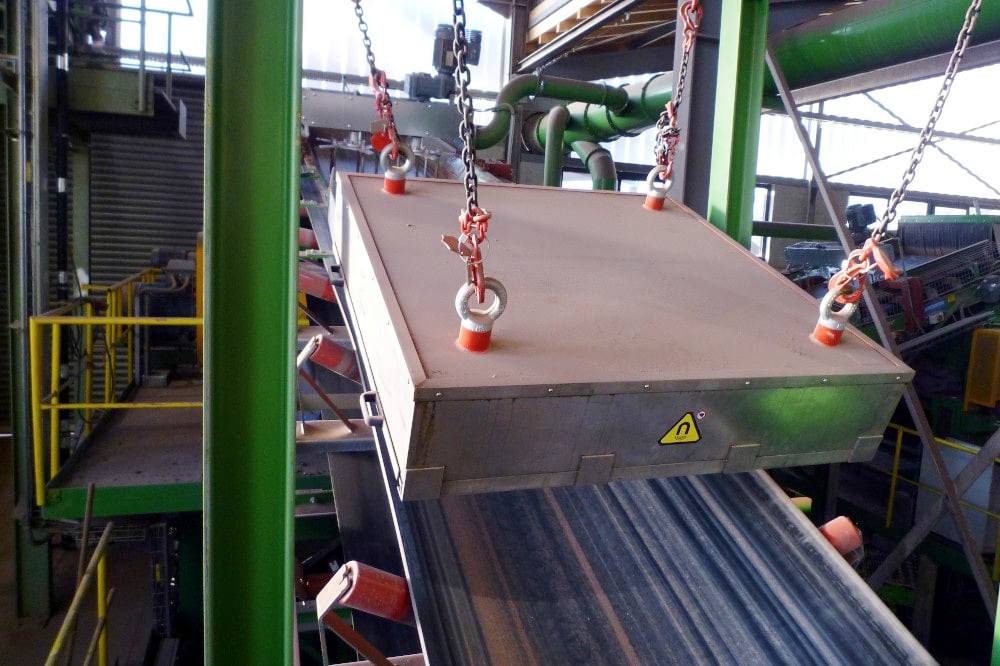 Al recibir la remolacha azucarera, es necesario eliminar las partículas ferrosas grandes (clavos, tornillos, etc.) que puedan aparecer, por ejemplo, durante el transporte de la remolacha desde el cultivador hasta la fábrica de azúcar. Muy a menudo la remolacha azucarera se transporta a la fábrica de azúcar mediante una cinta transportadora. Por lo tanto, los overbands o los imanes suspendidos (que sesuspenden sobre el transportador de remolacha)son los más utilizados. El objetivo es principalmente proteger la maquinaria de procesamiento y reducir la presencia de contaminantes ferromagnéticos en el producto final.